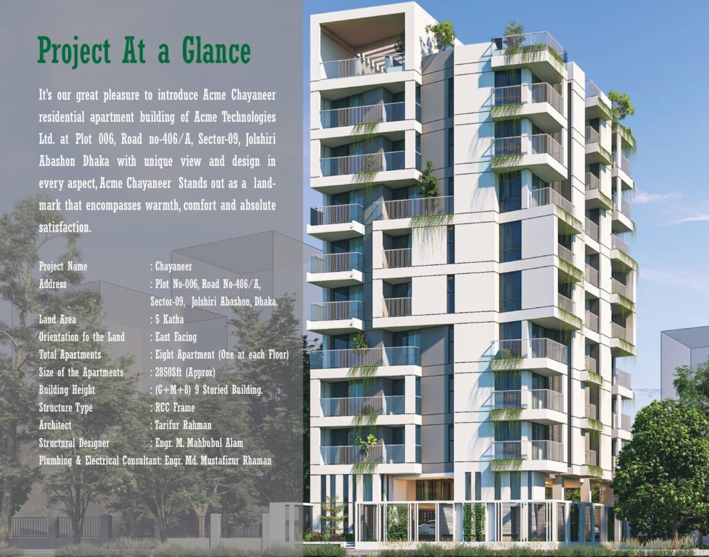 Acme Chayaneer is a premium residential project by Acme Technologies Ltd., located in Jolshiri Abashon, Dhaka. With modern architecture, spacious apartments, and top-quality structural design, the project promises warmth, comfort, and satisfaction for its residents.