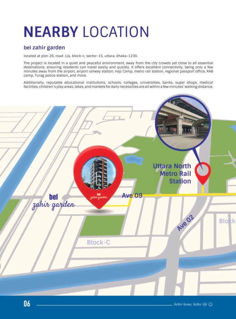 Bel Zahir Garden is a modern residential project in Uttara, Dhaka, designed for families who value convenience, connectivity, and comfort. Perfectly located beside the Uttara North Metro Rail Station, this G+7 residential building ensures effortless access to major parts of the city including Mirpur, Ashulia, Airport, and Sonargaon Janapath.