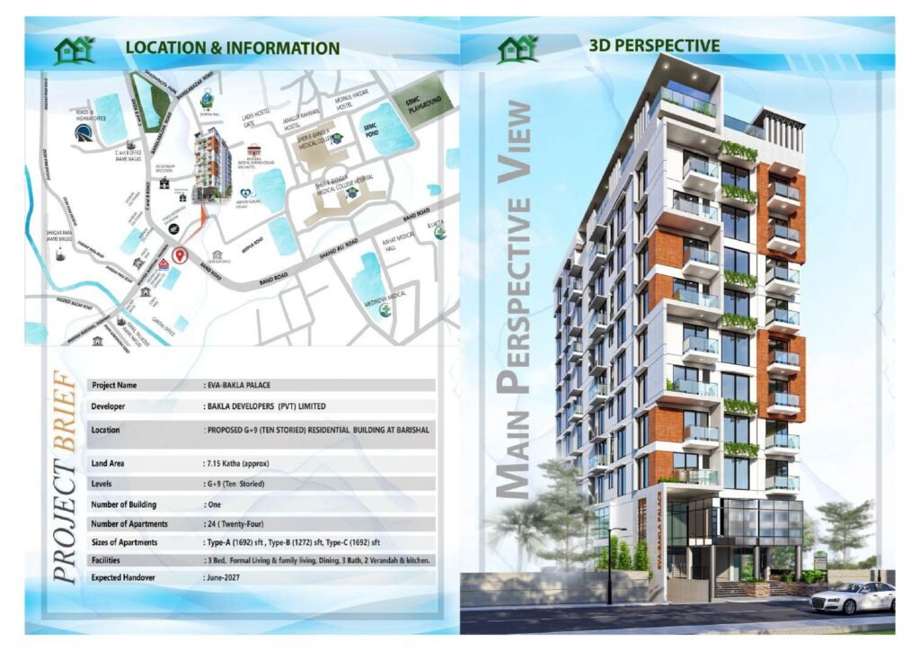 Welcome to EVA-BAKLA PALACE, an exclusive residential address by Bakla Developers (Pvt.) Limited, redefining urban luxury in the heart of Barishal. Rising elegantly as a G+9 (ten-storied) structure on a 7.15 katha land, this signature development offers a perfect blend of comfort, sophistication, and modern amenities.