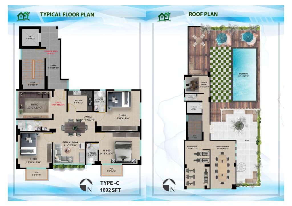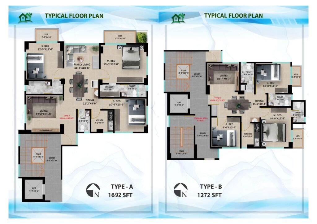 The project comprises 24 thoughtfully designed apartments, available in three spacious configurations — Type-A (1692 sft), Type-B (1272 sft), and Type-C (1692 sft) — each crafted to ensure maximum functionality and aesthetic appeal. Every unit features 3 bedrooms, formal and family living areas, dining space, 3 bathrooms, 2 verandahs, and a modern kitchen, creating a warm and functional home for your family.